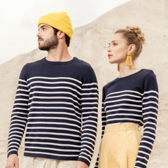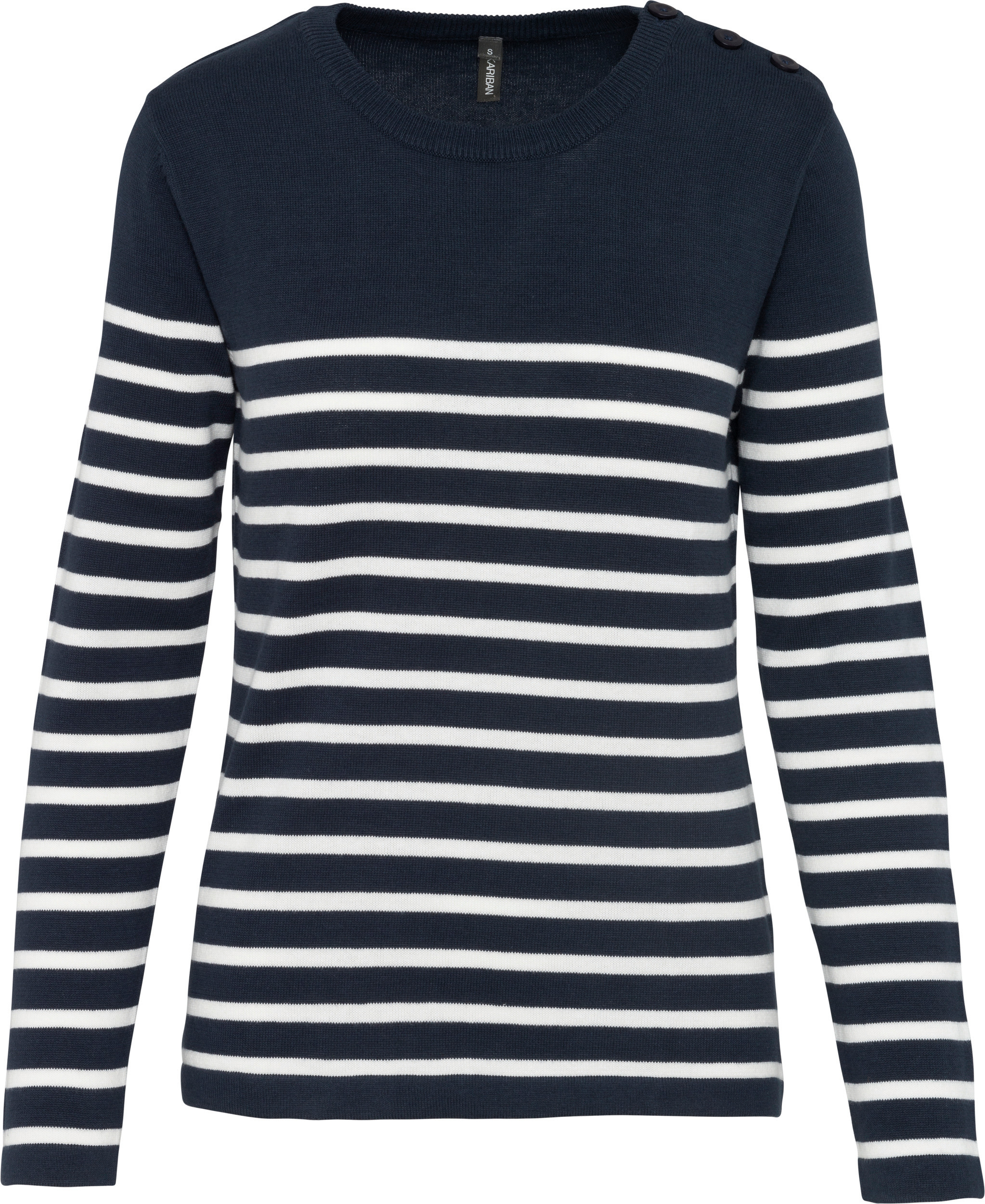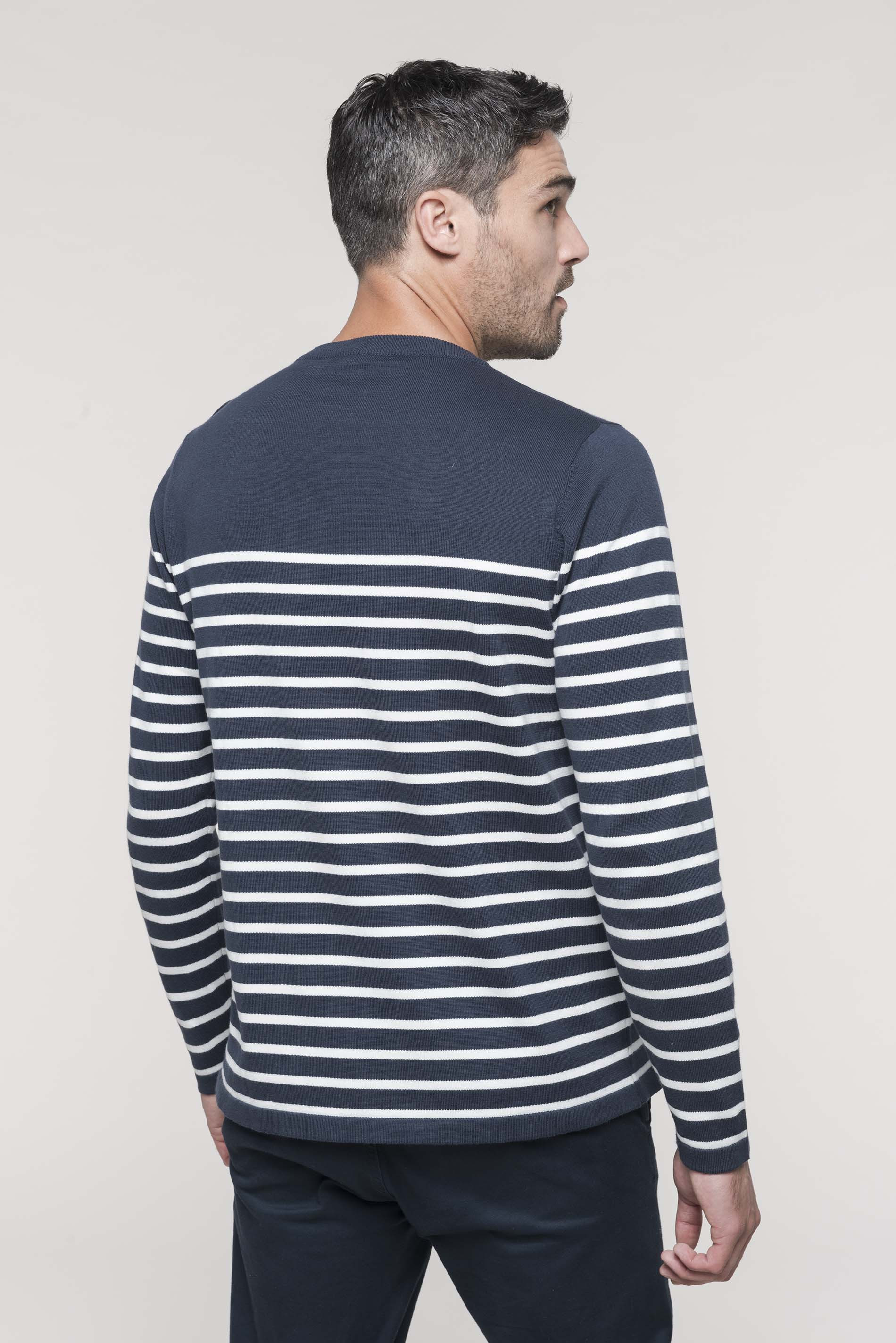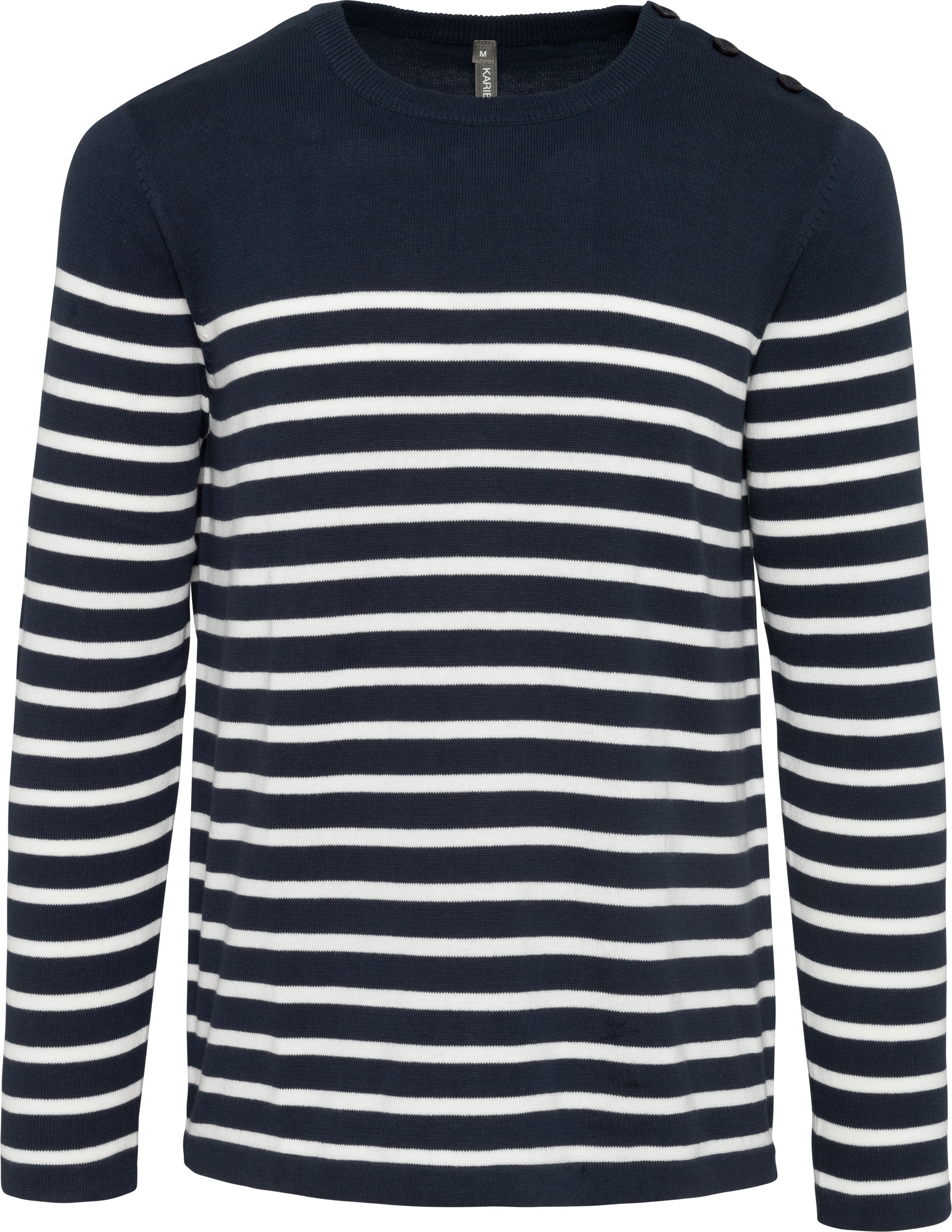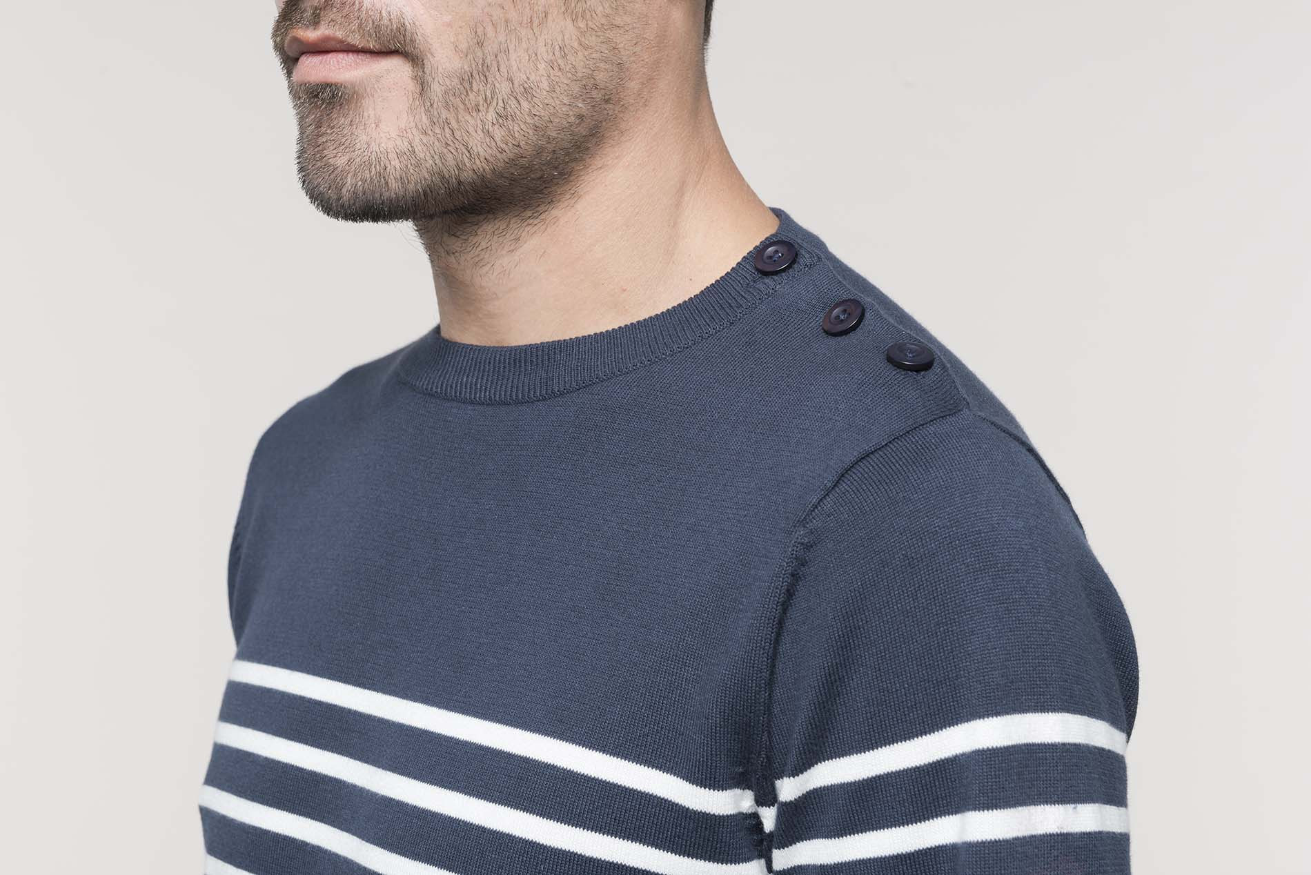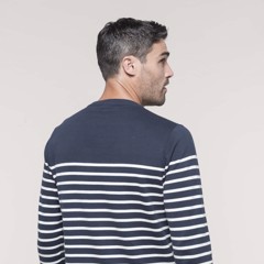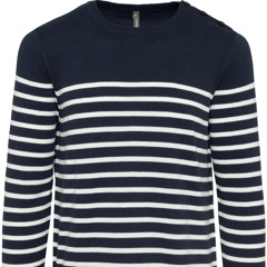 Kariban * K989 - Gestreepte Herentrui * 100% katoen. Gauge 12. Schouderopening links met 3 ton-sur-ton knopen. 1 x 1 ribboord aan de halsopening. Gebreide mouwuiteinden en onderkant kledingstuk in dubbele dikte.