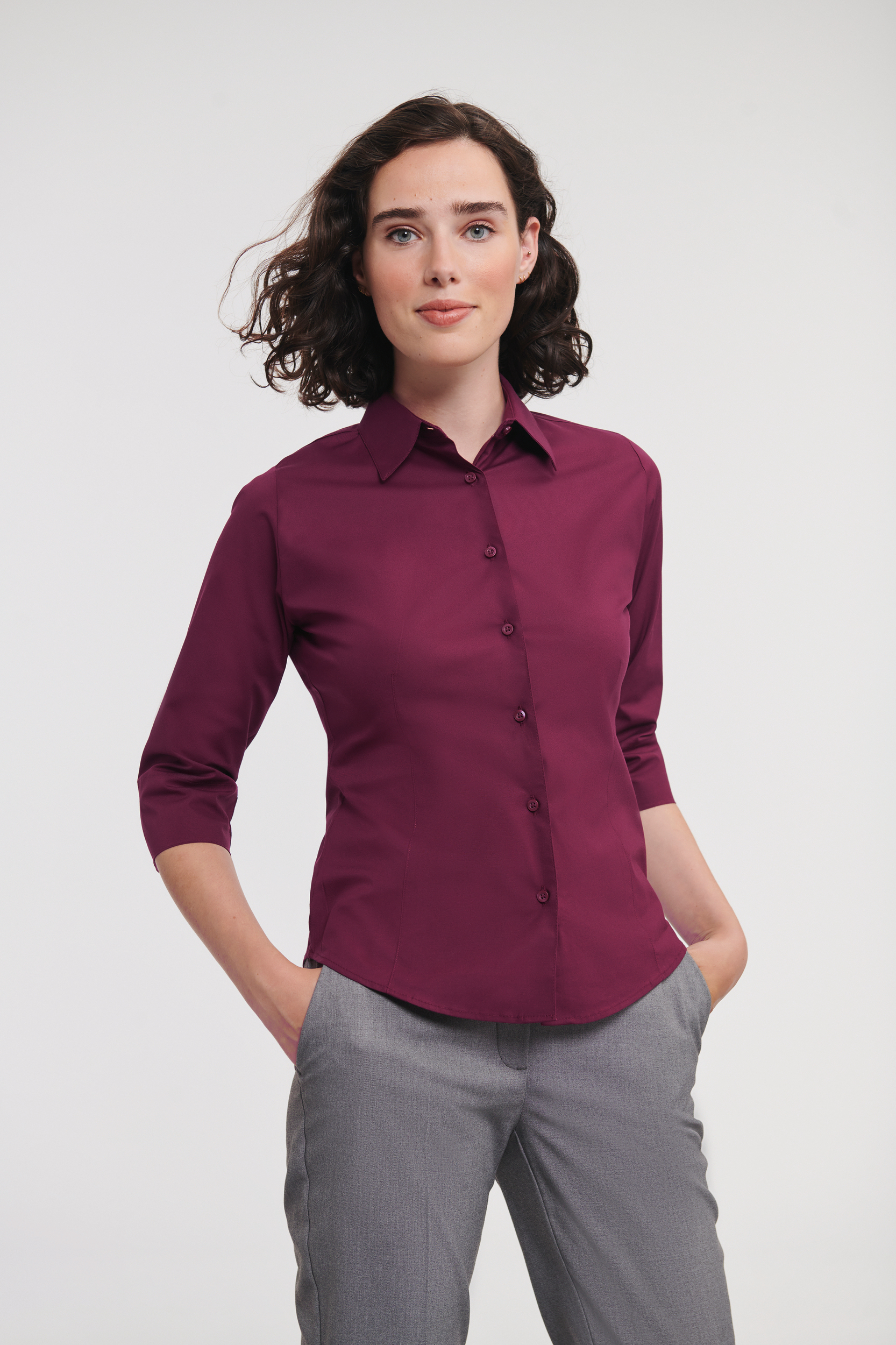 Russel - RU946F (Z946F) - Ladies' Easy Care Fitted Shirt 3/4 Mouwen * 140 g/m² - 97% katoen / 3% elasthan poplin. Fitted model. Gladde stof met stretch zorgt voor comfort en mooie pasvorm. 1 knoopje aan de kraag. Plooitjes ter hoogte van de borst en aan de achterkant (halverwege). Mouwen kunnen omgeslagen worden. Afgeronde onderkant. Reserveknoopjes. EasyCare.